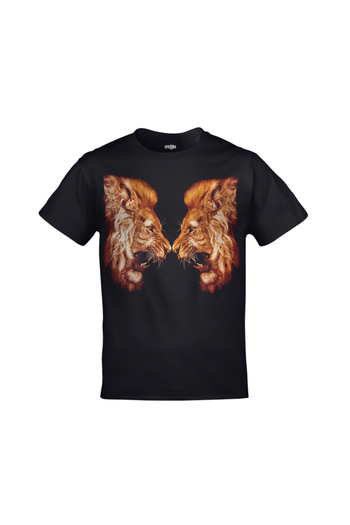 Iki Aslan Baskılı Unisex Siyah Tshirt