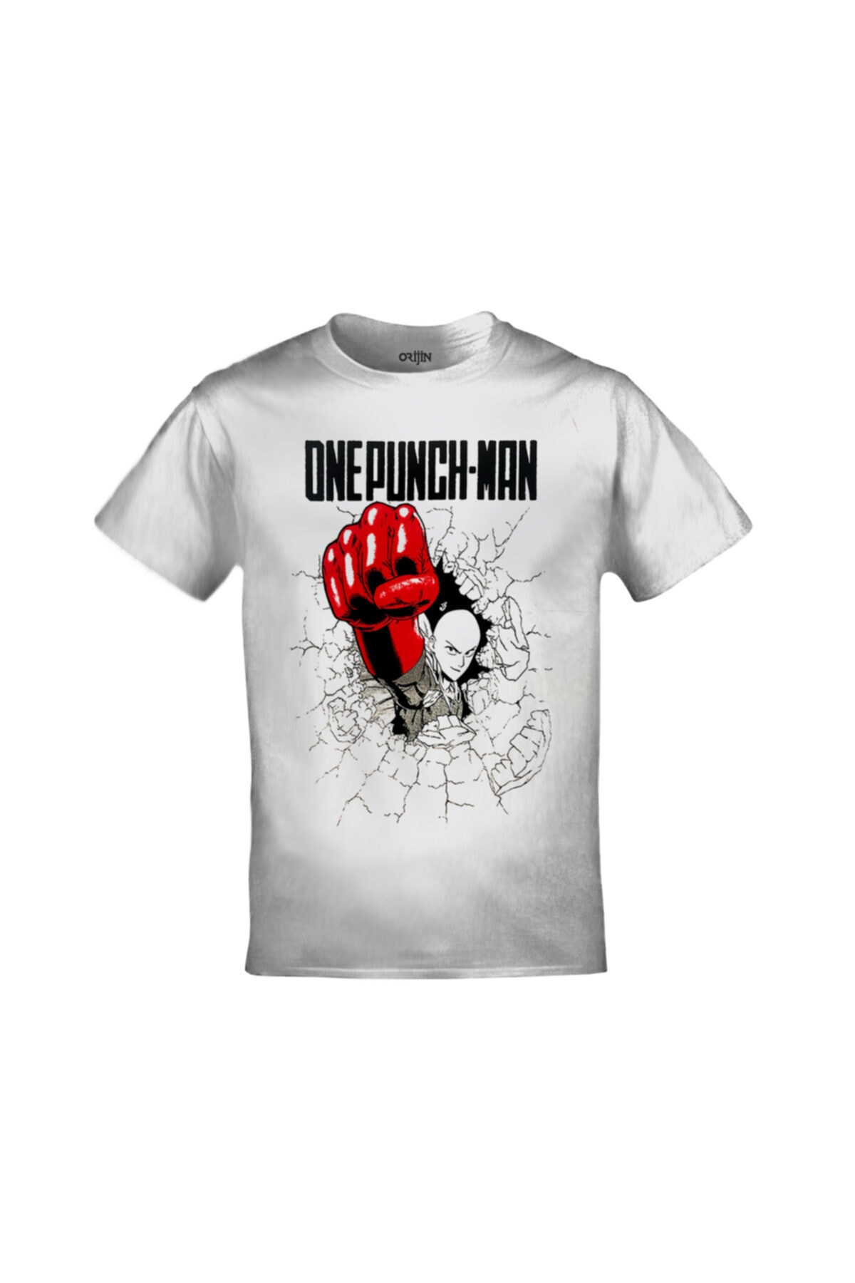 Erkek Beyaz One Punch Man Baskılı T-shirt