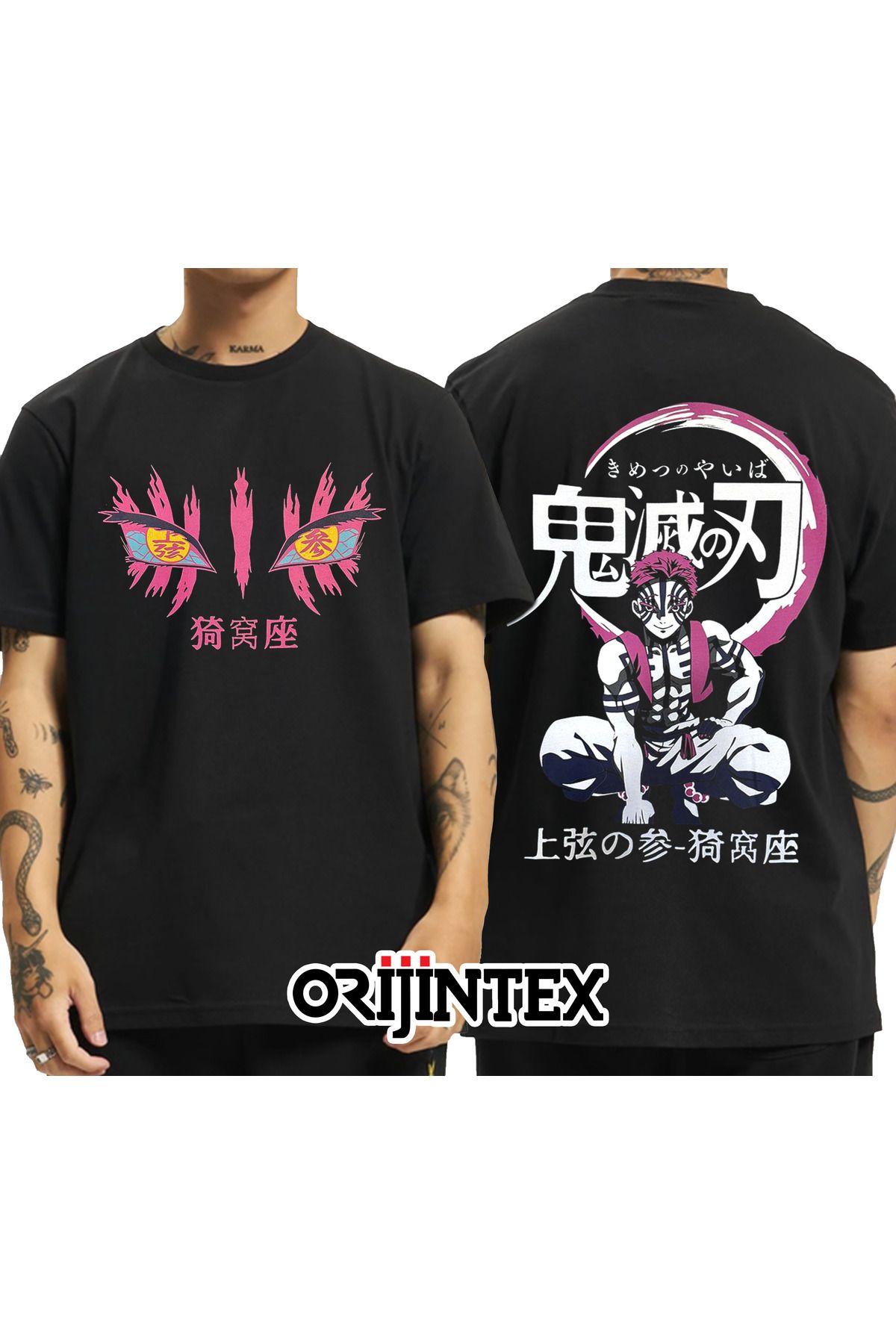 Demon Slayer Yaiba Akaza Ön Arka Baskılı Unisex Anime Siyah Tshirt