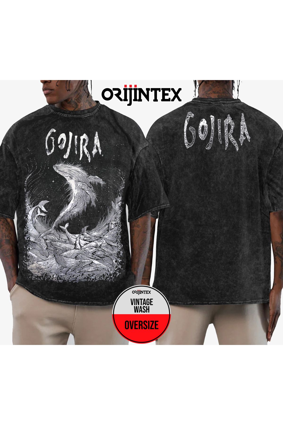 Gojira Wood Block Whales Ön Arka Baskılı Yıkamalı Oversize Vintage Tshirt