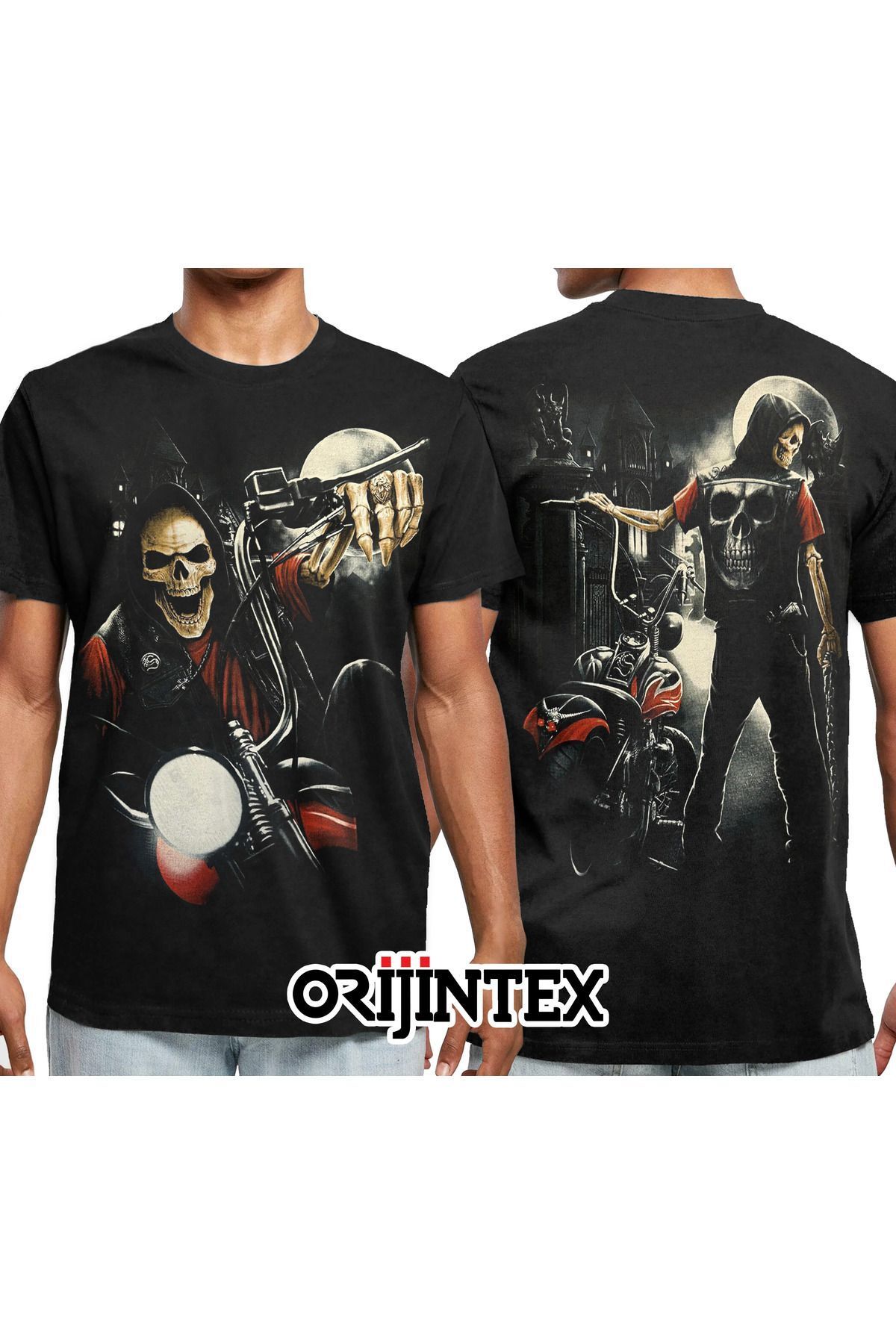 Motorsikletli Kurukafa Skull Motobiker Ön Arka Baskılı Unisex Siyah Tshirt