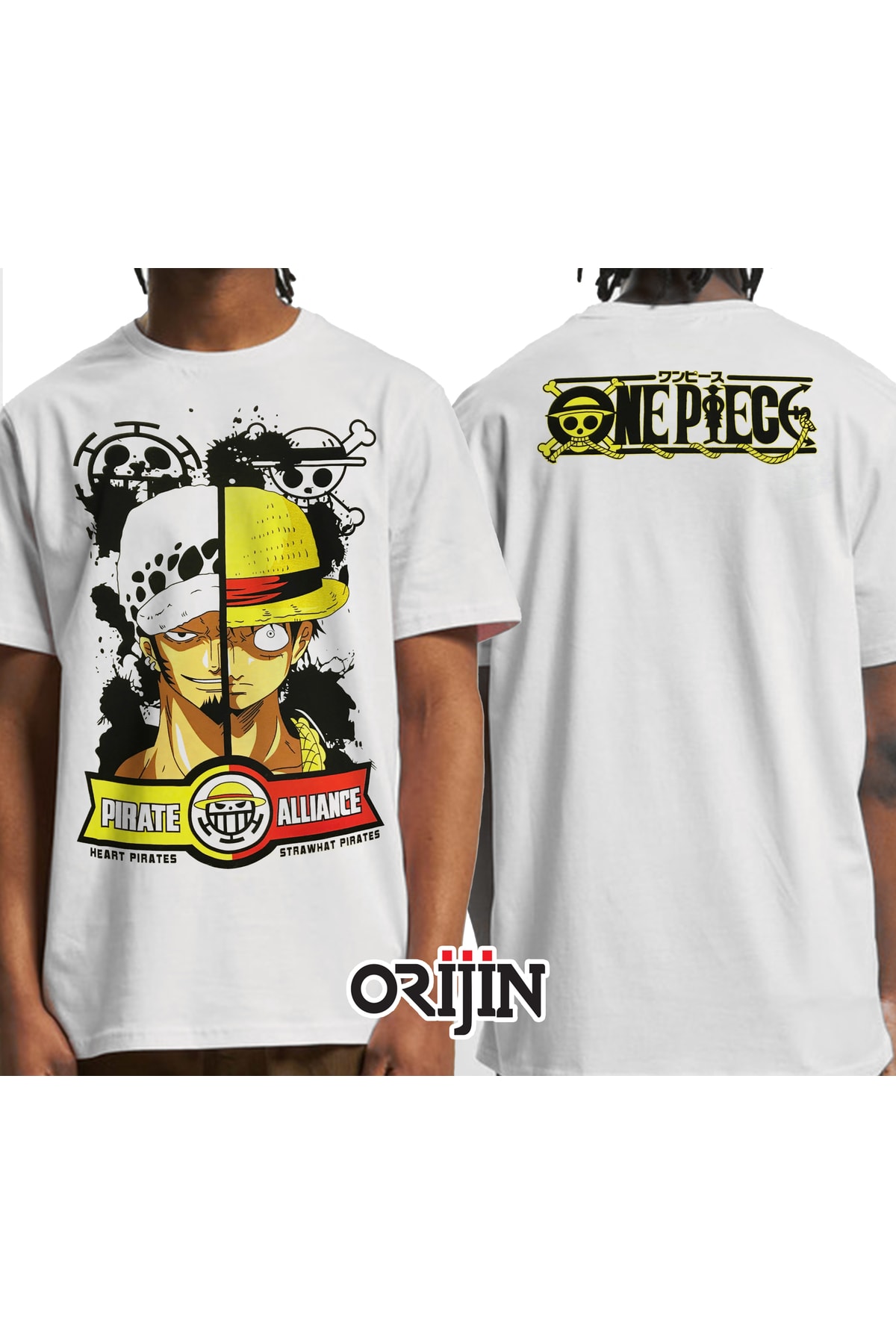 One Piece Pirate Alliance Heart Pirates Strawhat Pirates Ön Arka Baskılı Unisex Beyaz Tshirt