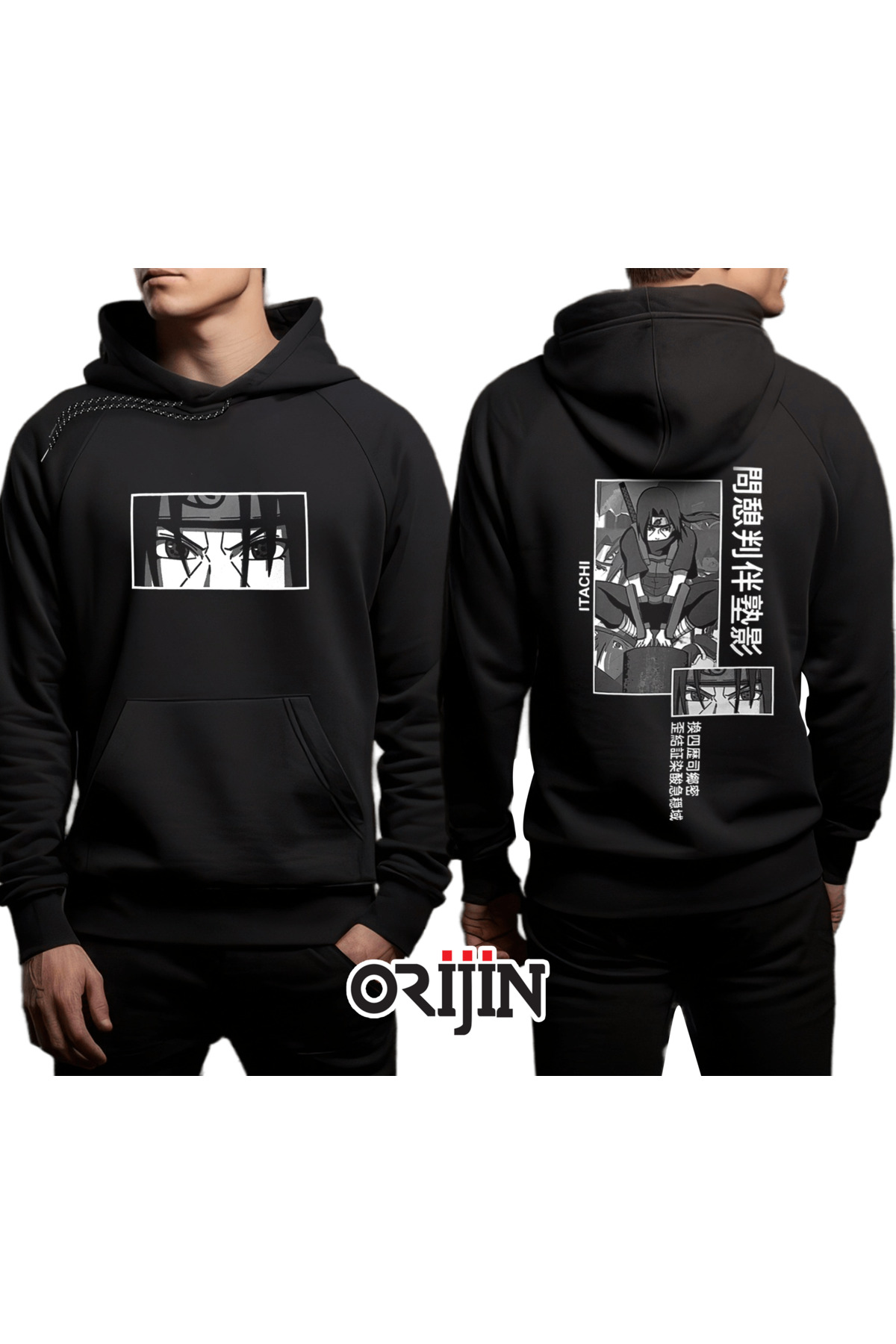 Naruto Itachi Ön Arka Baskılı Siyah Kapşonlu Sweatshirt